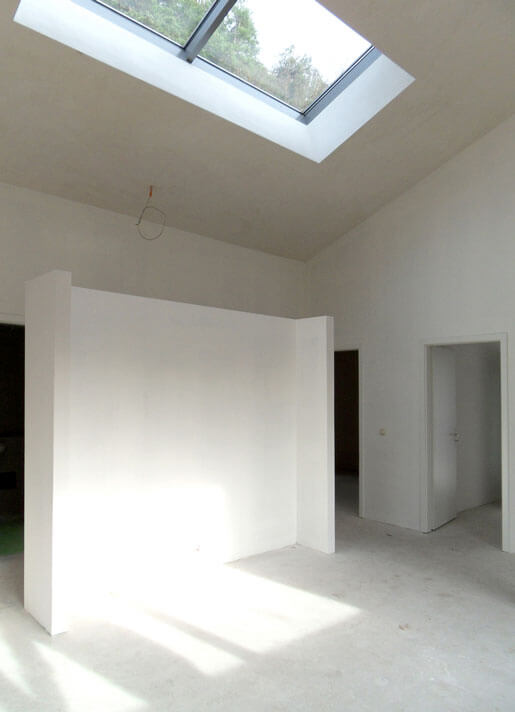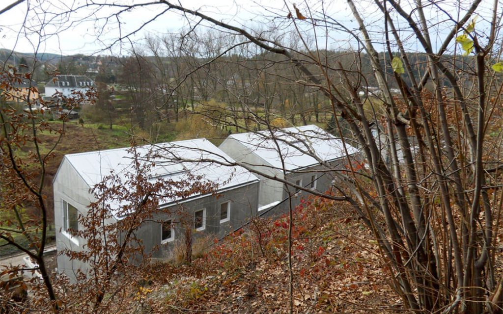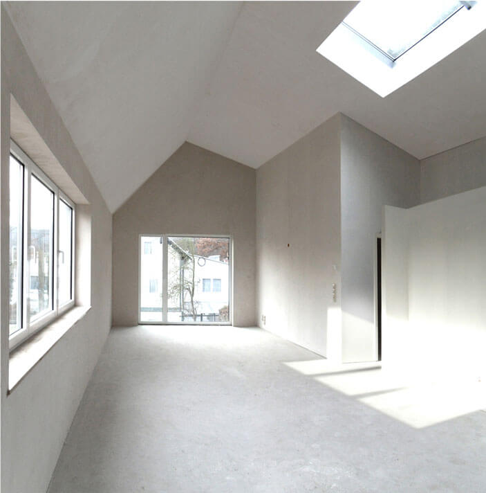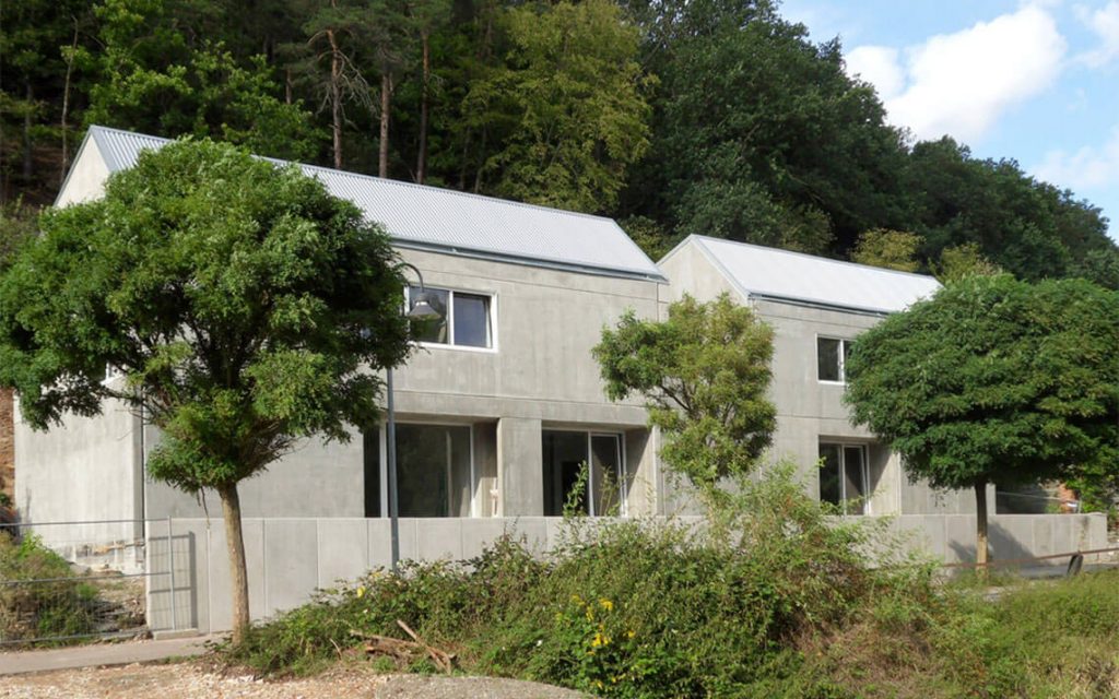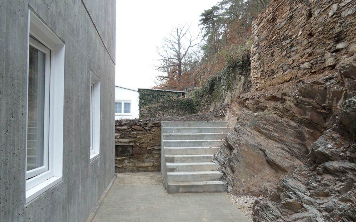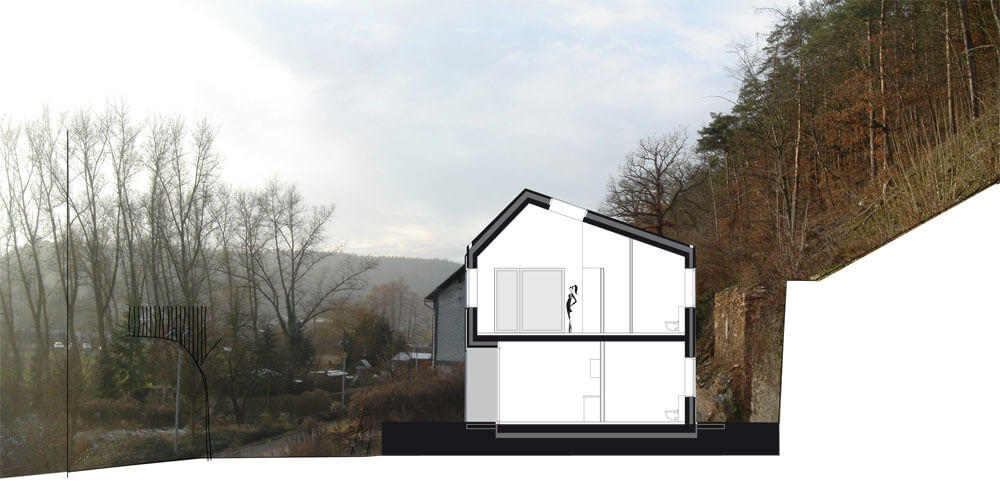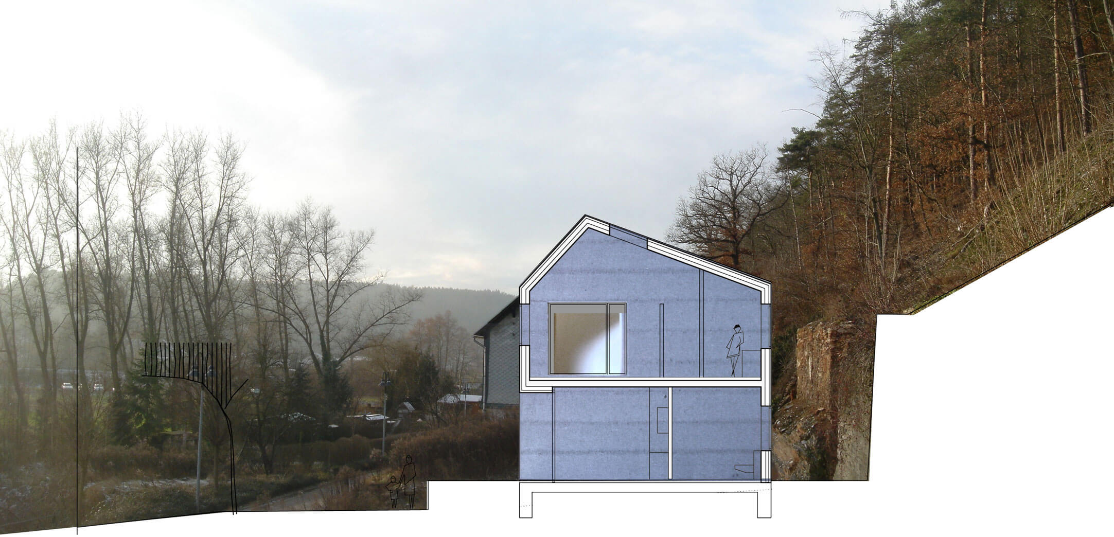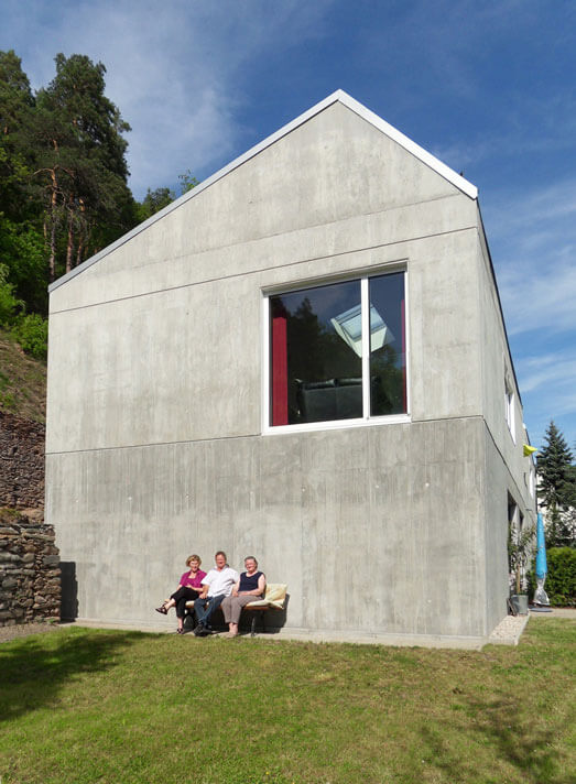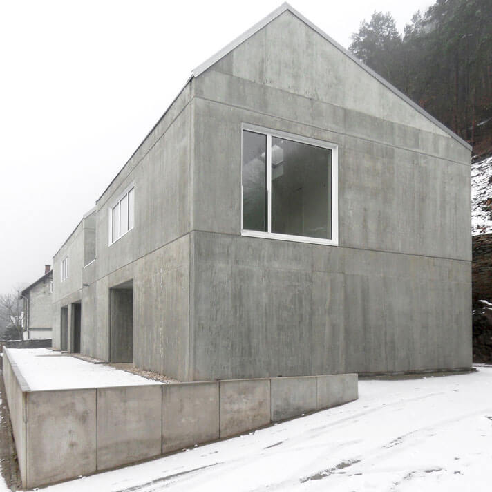 Das Baugrundstück liegt zentrumsnah, am Rand der kleinen Stadt Berga. Das Wohngebäude nutzt das schmale, eher ungünstig zugeschnittene Grundstück entlang einer Nebenstraße und vor einem steil aufragenden Hang. Die vorgegebene Nord-Süd-Ausrichtung wird verstärkt durch die massive Baukonstruktion aus Sichtbeton, die der hohen Energieeffizienz des Baus zugutekommt. Die Entwicklung des Konzeptes und die Ausführung des Entwurfes in Sichtbeton mit Kerndämmung setzte eine enge Zusammenarbeit zwischen Architekt und Bauherr, voraus. Entstanden ist ein Haus mit einem charakteristischen Erscheinungsbild, welches durch seine Materialität, asymmetrische Form und Objekthaftigkeit geprägt ist.