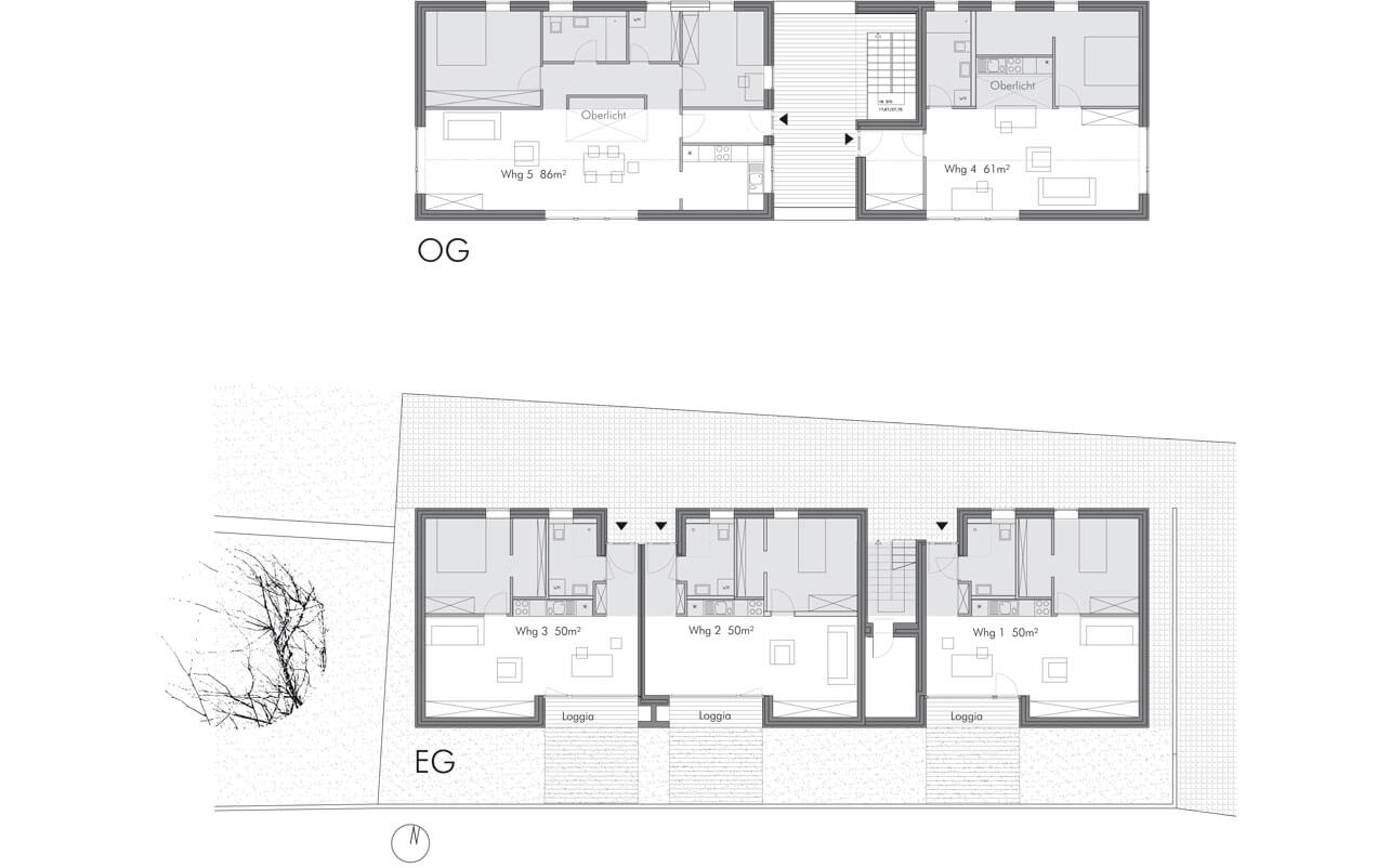 Zwei Familienwohnungen im Obergeschoss und drei barrierefreie Wohnungen im Erdgeschoss erlauben die Nutzung als Mehrgenerationshaus.