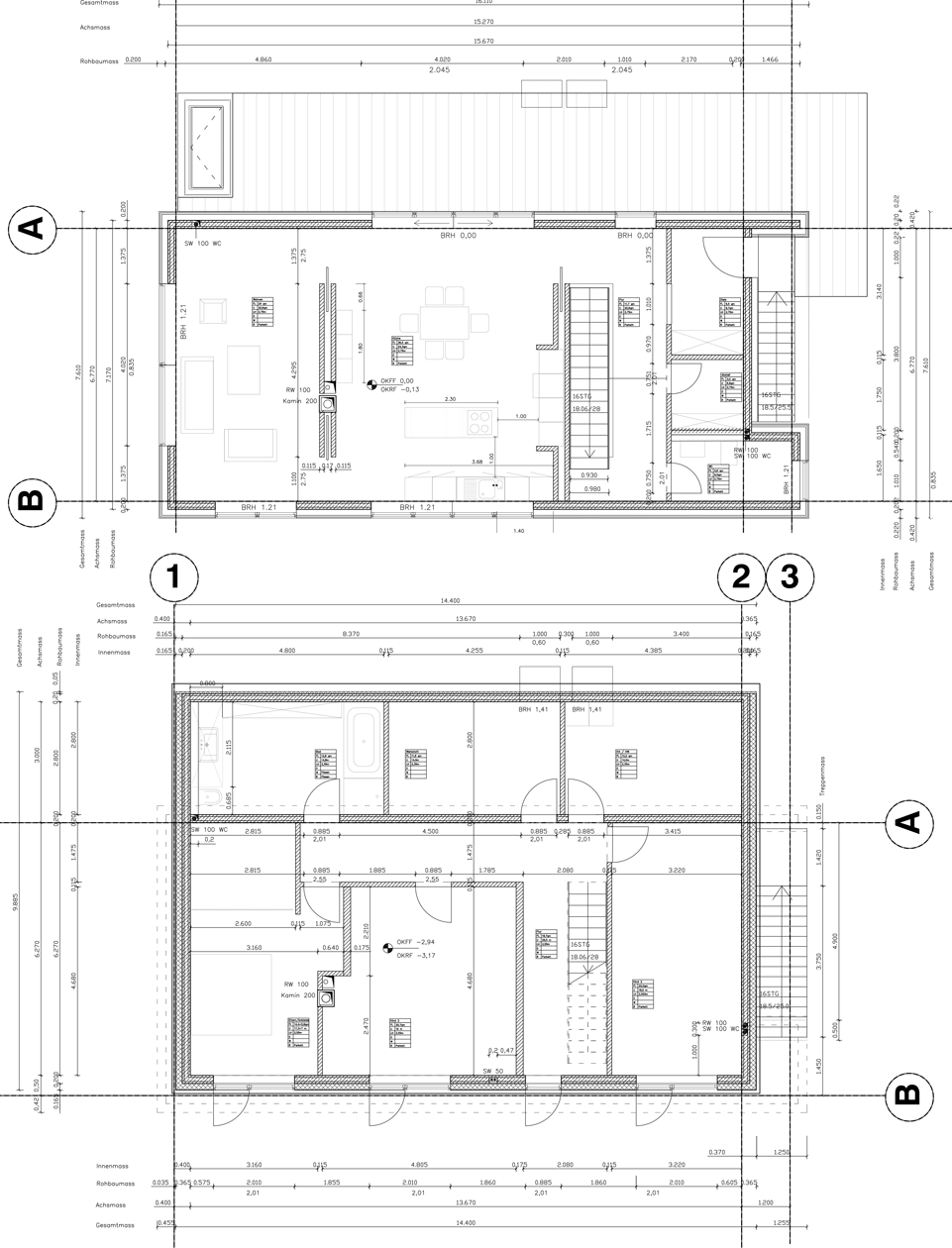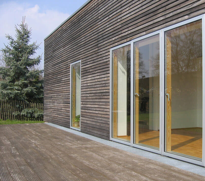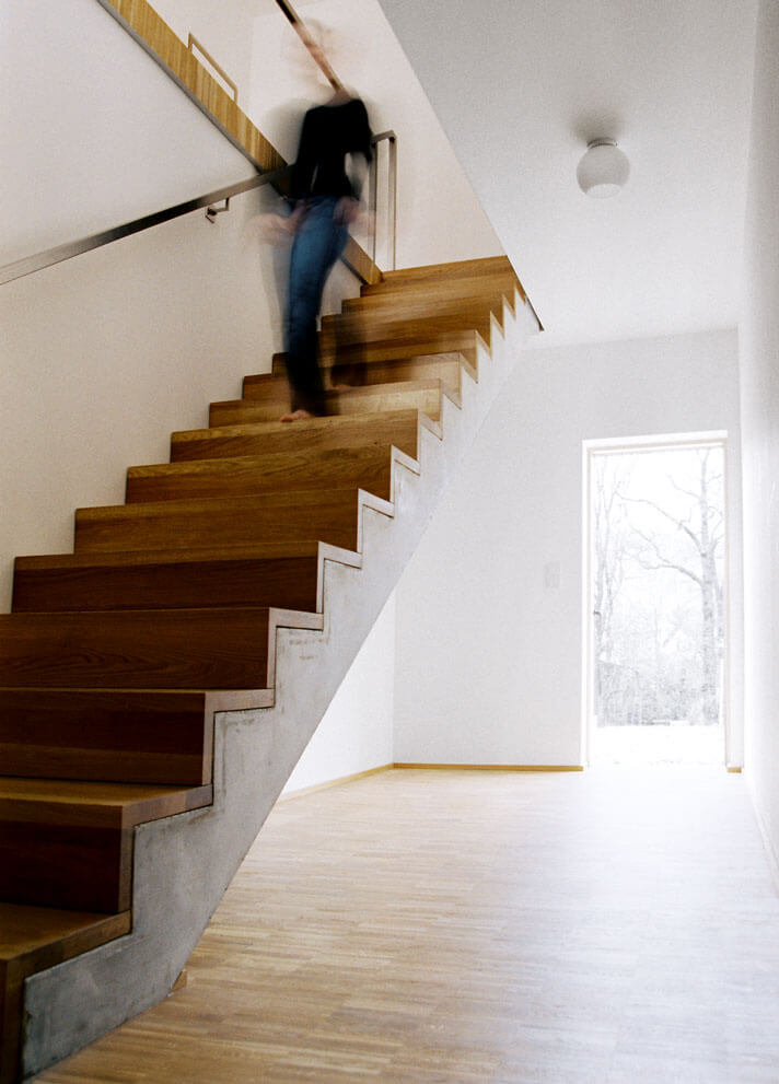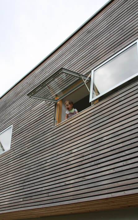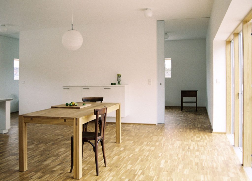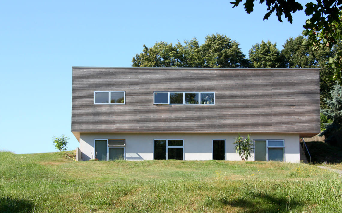 Eine junge wachsende Familie, wünschte sich ein Haus mit kleinem Budget zu realisieren. Gesucht wurde nach wirtschaftlichen Konstruktionen, Langlebigkeit, geringen Folge- und Betriebskosten und nach einer Grundrisslösung, die auf die unterschiedlichen zukünftigen Familienzusammensetzungen reagieren kann. Entstanden ist ein modernes Wohnhaus, welches sich in die dörfliche Umgebung sensibel integriert. Quer zum Hang entstand ein Baukörper, der das Grundstück teilt, in einen geschützten privaten Familiengarten im Südwesten mit Blick über die Landschaft und eine zur Strasse gerichteten Wiese mit dem Zugang.