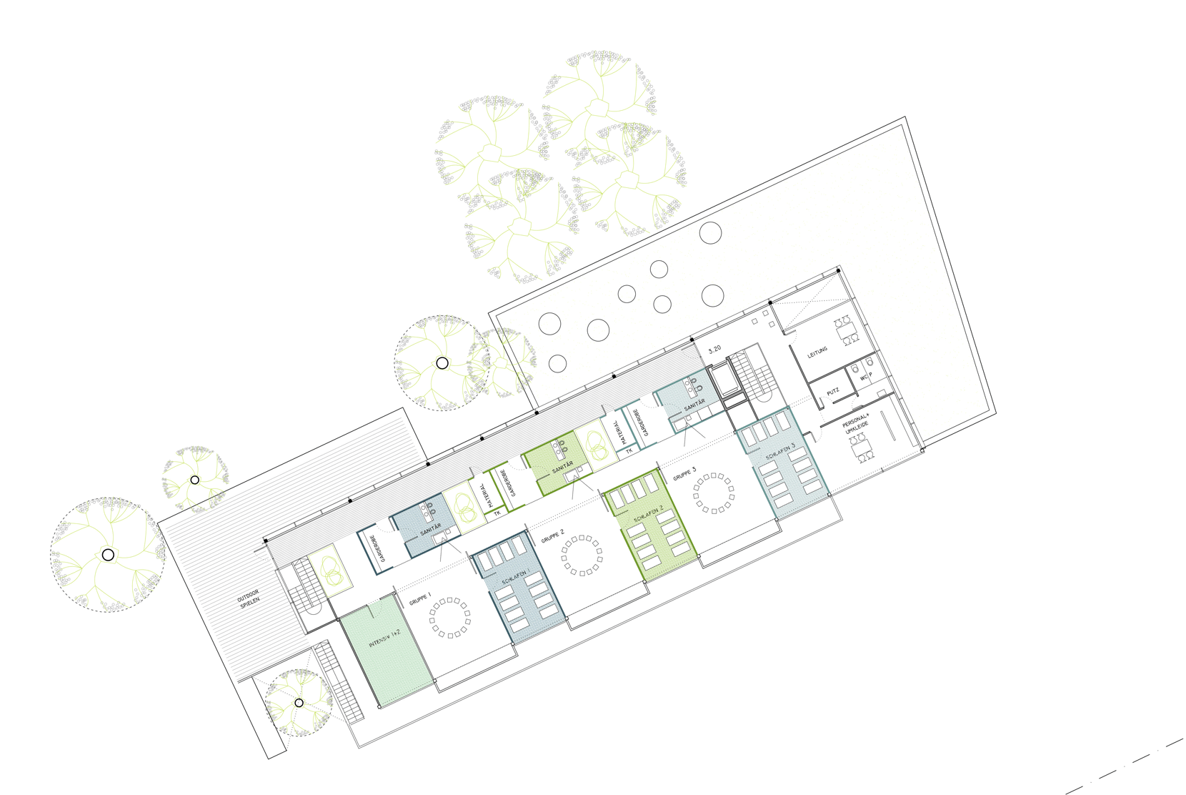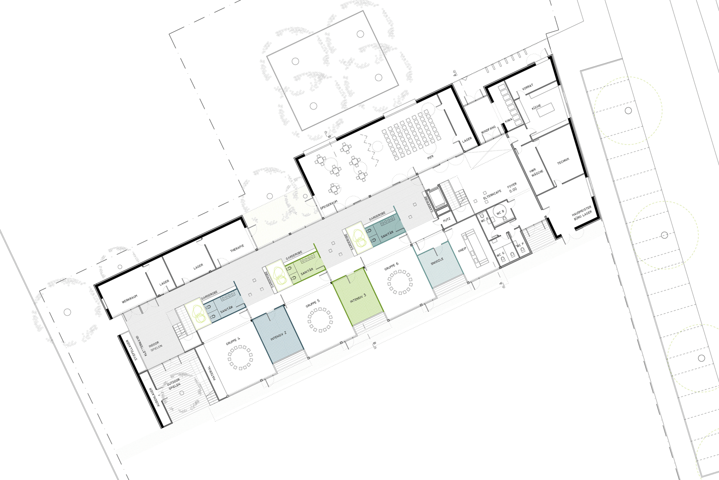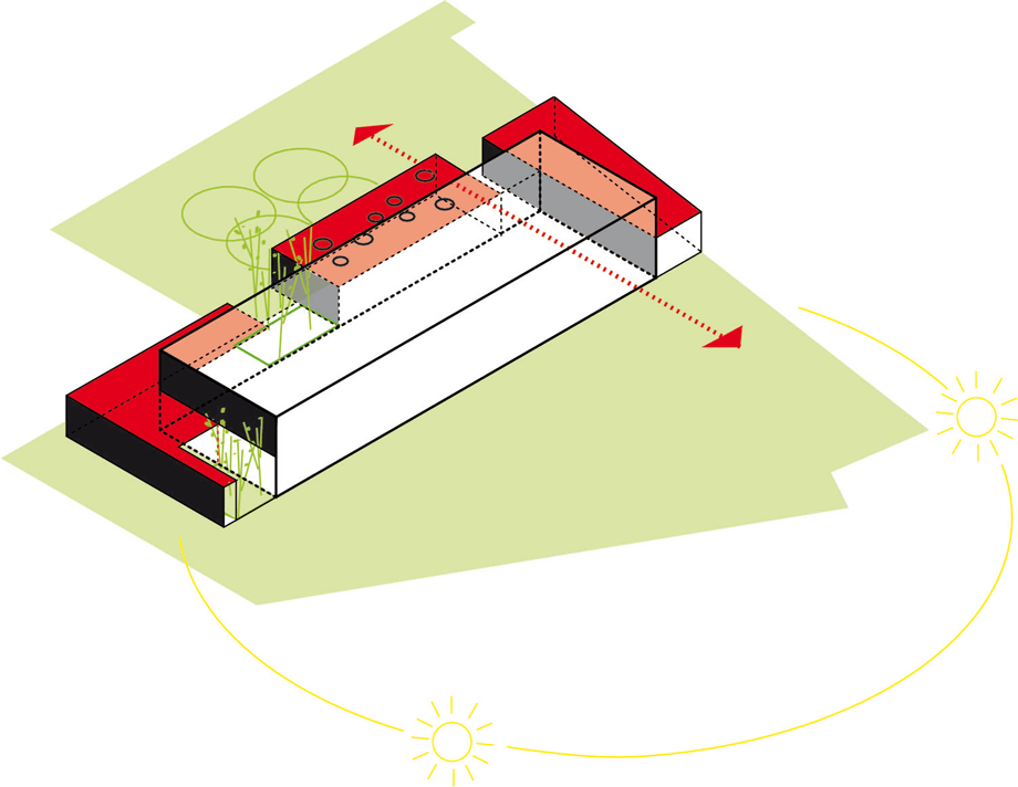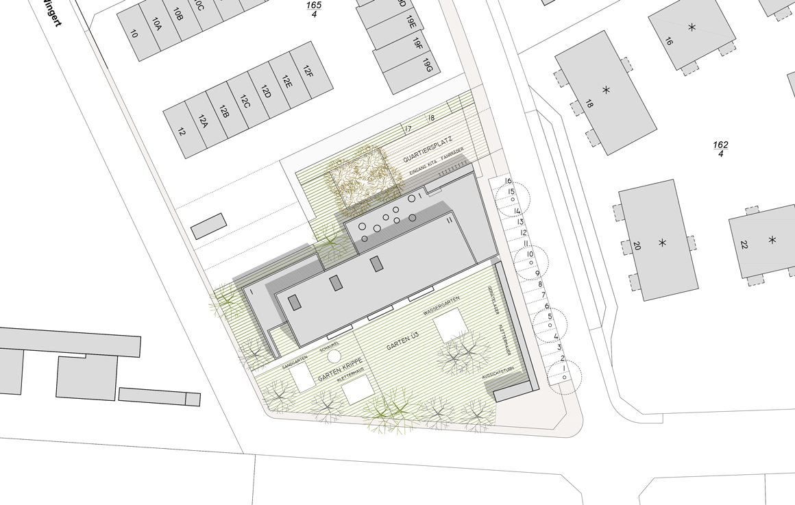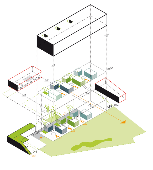 Der Entwurf fügt sich als ordnendes Element in den städtebaulichen Kontext ein. Die Ost-West Ausrichtung des länglichen Baukörpers schafft eine klare Zonierung des vorhandenen Grundstücks und fungiert gleichzeitig als räumlicher Abschluss der städtebaulichen Struktur. Nördlich des Gebäudes entsteht ein öffentlicher Raum, der als Quartiersplatz einen Ort des Treffens und eine gewisse Zentralität für das benachbarte Wohngebiet anbietet.