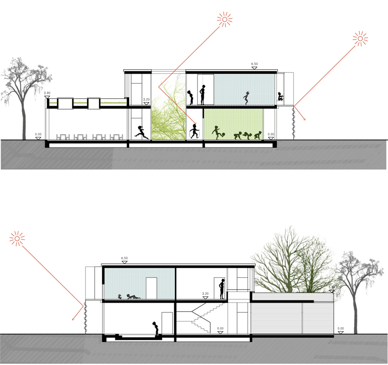 Das Gebäude besteht grundsätzlich aus einem zweigeschossigen Baukörper, der ausschließlich die Räume der Kinder beherbergt. Dieser „Kern“ wird durch drei eingeschossigen Baukörper ergänzt, welche als eine Art schützend und dienender Sockel die restlichen Funktionen des Gebäudes beinhaltet. Dieser Sockel wirkt, ähnlich wie bei einer Burg, als eine Wallanlage, die spielerisch erobert werden kann, um ein durch Licht und Farbe geprägtes Innere zu entdecken.