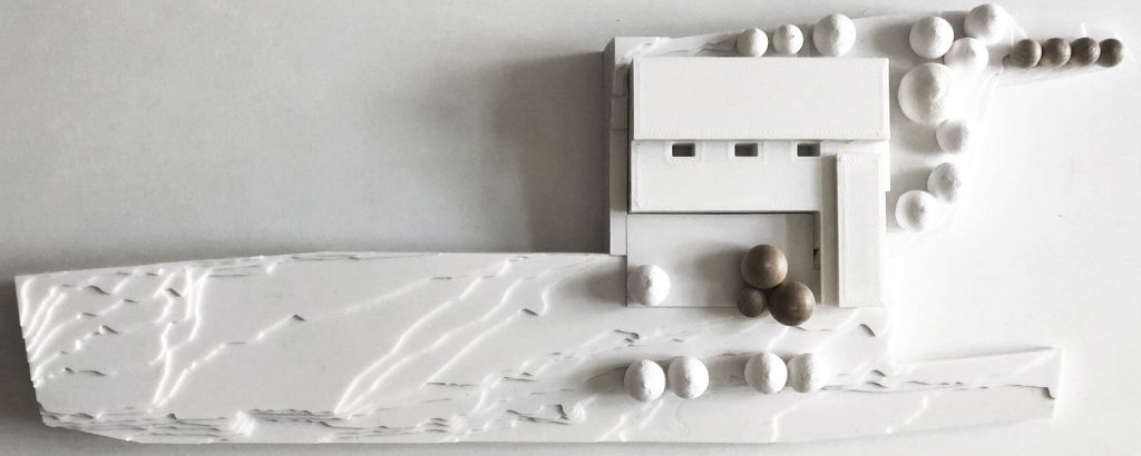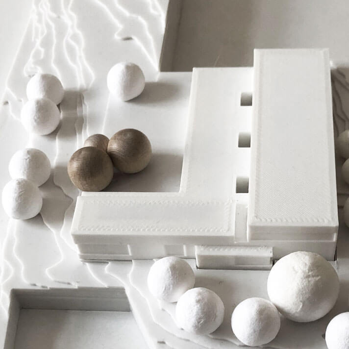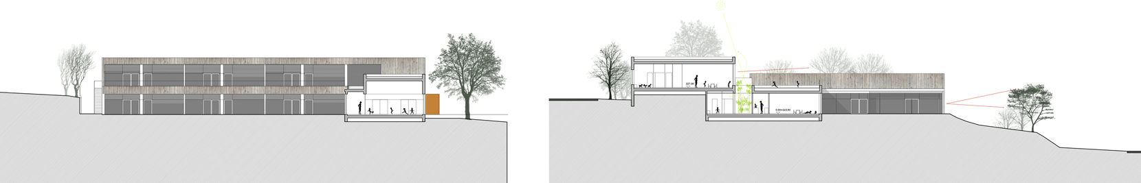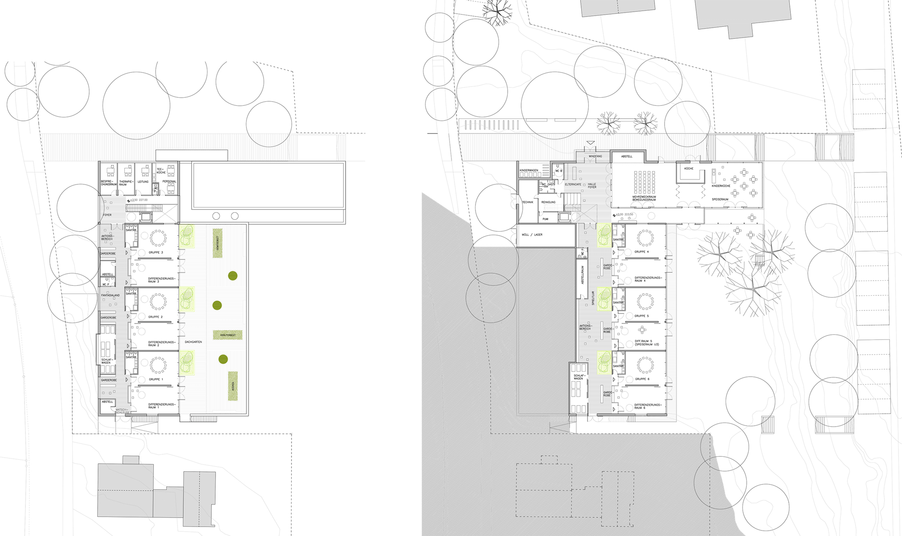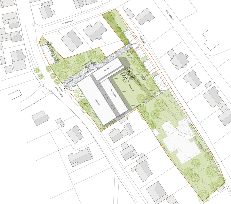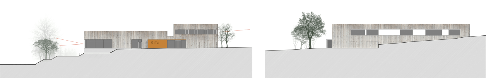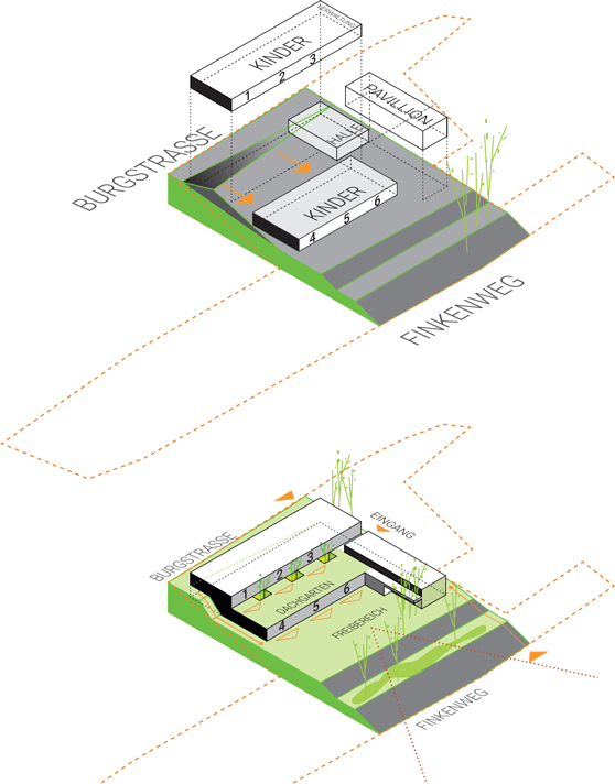 Das Gebäude der neuen Kindertagesstätte fügt sich als Fortsetzung des Baubestandes entlang der Burgstraße ein und konsolidiert die vorhandene Bebauung sowie das Straßenbild städtebaulich. Der topografischen Situation folgend, gliedert sich der Hauptbaukörper in zwei Elemente, die sich übereinanderstapeln, so dass der städtebauliche Maßstab des Gebäudes dem kleinteiligen Bestand gerecht wird. Das untere Bauteil „schiebt“ sich aus der Topografie heraus und bietet dem Oberen die Nutzung eines Dachgartens an.