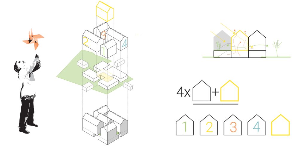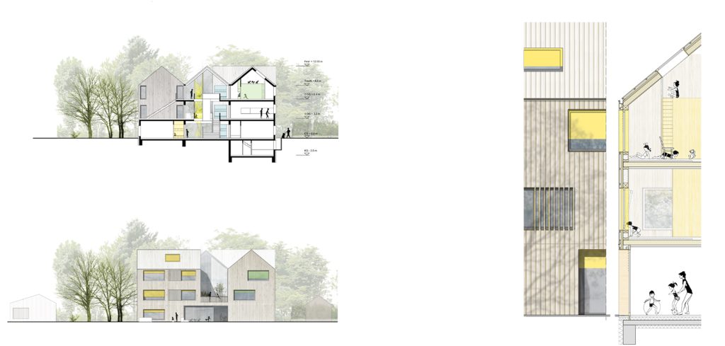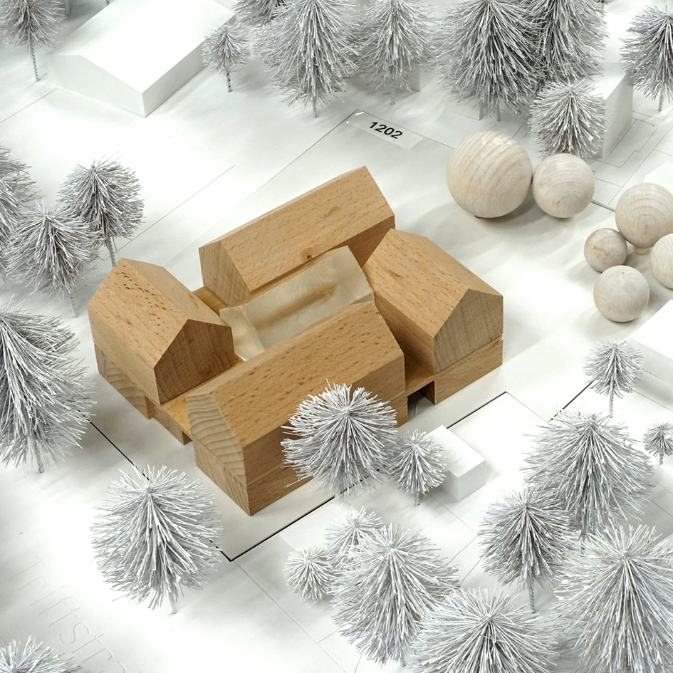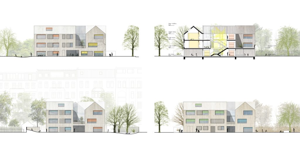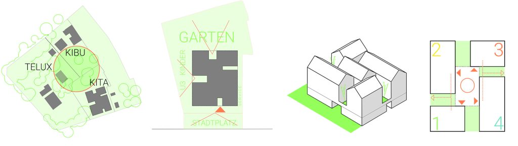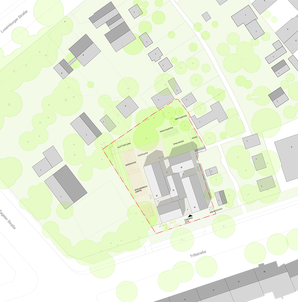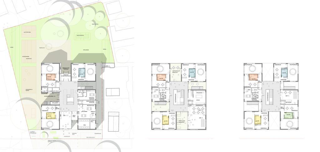 Der Entwurf platziert das Volumen des Neubaus straßenbegleitend und kompakt entlang der Triftstraße. Mit seinem Stadtplatz als Vorzone tritt das 3-geschossiges Gebäude mit geneigten Dächern gut proportioniert im Stadtraum in Erscheinung. Die raumsparende Setzung und Anordnung des Volumens ermöglicht es, nach Westen und nach Norden einen verhältnismäßig großen Teil des Grundstücks von Bebauung frei zu halten und eine Vernetzung mit den umliegenden Einrichtungen zu ermöglichen. Gestalterisch entwickeln die Verfasser*innen ein Gebäudeensemble mit vier archetypischen Häusern auf einem gemeinsamen Sockel. Den vier sog. Kinderhäusern werden jeweils Farbschemata zugeordnet, um die Wiedererkennbarkeit für die Kinder zu steigern. Die mit dieser Lösung entstehende Differenzierung der Baukörper erzeugen einen angenehm dorfähnlichen Maßstab, was vom Preisgericht gewürdigt wird. Verbunden werden die Kinderhäuser durch das zentrale Spielhaus, das mehrere Funktionen übernimmt. Insgesamt handelt es sich um einen konzeptionell wertvollen Beitrag, der eine hohe räumliche Qualität und Durcharbeitung erkennen lässt. Auch der ökologische Anspruch des Entwurfs wird gewürdigt.